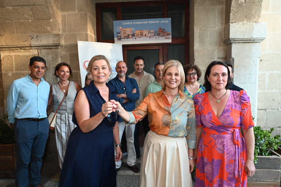 La alcaldesa de Jerez, María José García-Pelayo, acompañada de la delegada de Comercio, Nela García, ha hecho oficial la cesión a la Asociación de Comerciantes del centro de Jerez (Acoje) de un local en el Edificio Los Arcos, para que “continúe realizando desde aquí su actividad de promoción del comercio en el centro de la ciudad y a ofrecer un punto de encuentro y una mano amiga a otras personas que quieran emprender en el corazón de la ciudad”. El acto de entrega de llaves tuvo lugar este lunes por la tarde, en presencia de la junta directiva de Acoje y de un grupo de comerciantes de la asociación, horas después de que la regidora firmara un documento de cesión de espacio con la presidenta, Ana María Pérez Chacón.