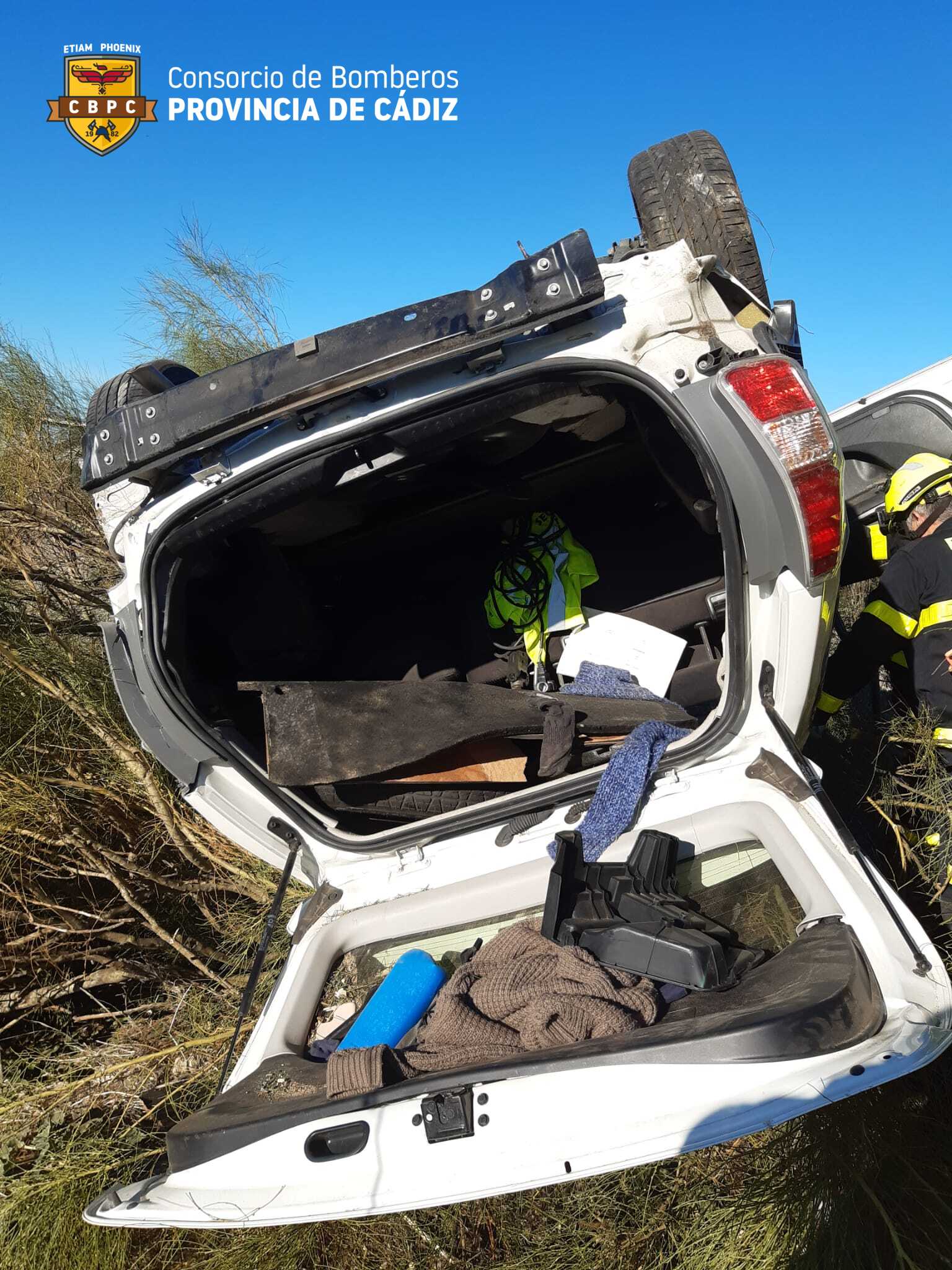 El Consorcio de Bomberos del Parque de Jerez de la Frontera han intervenido este pasado domingo por la tarde en un accidente de tráfico por colisión entre dos vehículos, uno de ellos un taxi y otro un turismo, en la AP-4que se ha saldado con un vehículo volcado y sin heridos.