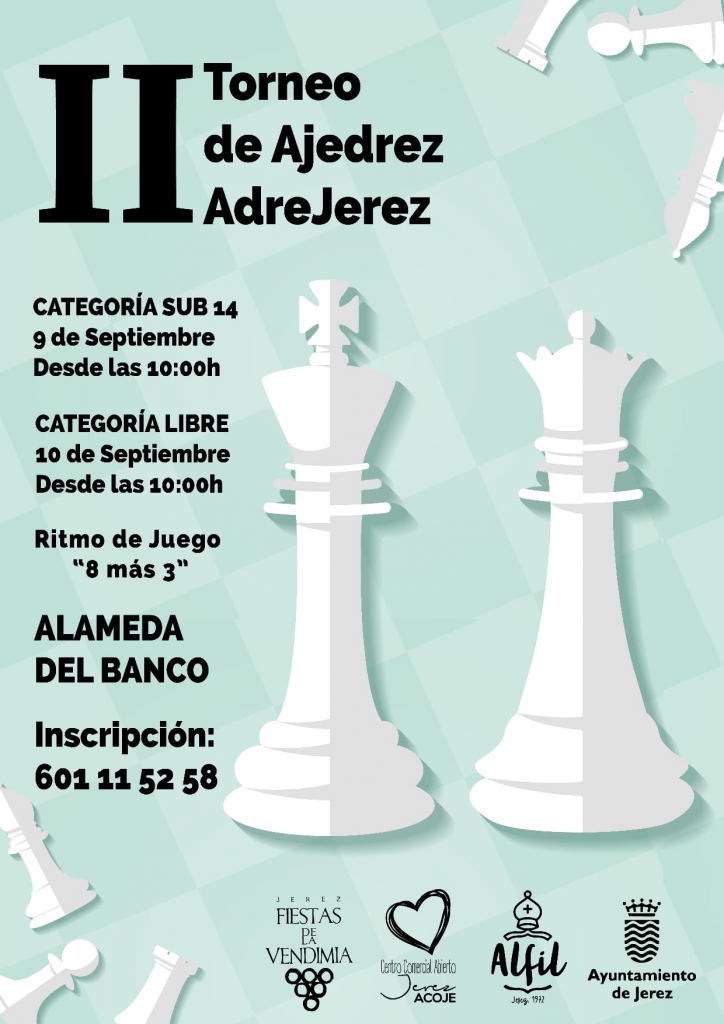 De nuevo llega la segunda edición del Torneo de Ajedrez ‘ADREJEREZ’. La céntrica alameda del banco acogerá este torneo para los amantes de este juego de mesa el 9 de septiembre. Y al día siguiente, se reanudará la edición en la plaza de la Asunción con distintas categorías.
