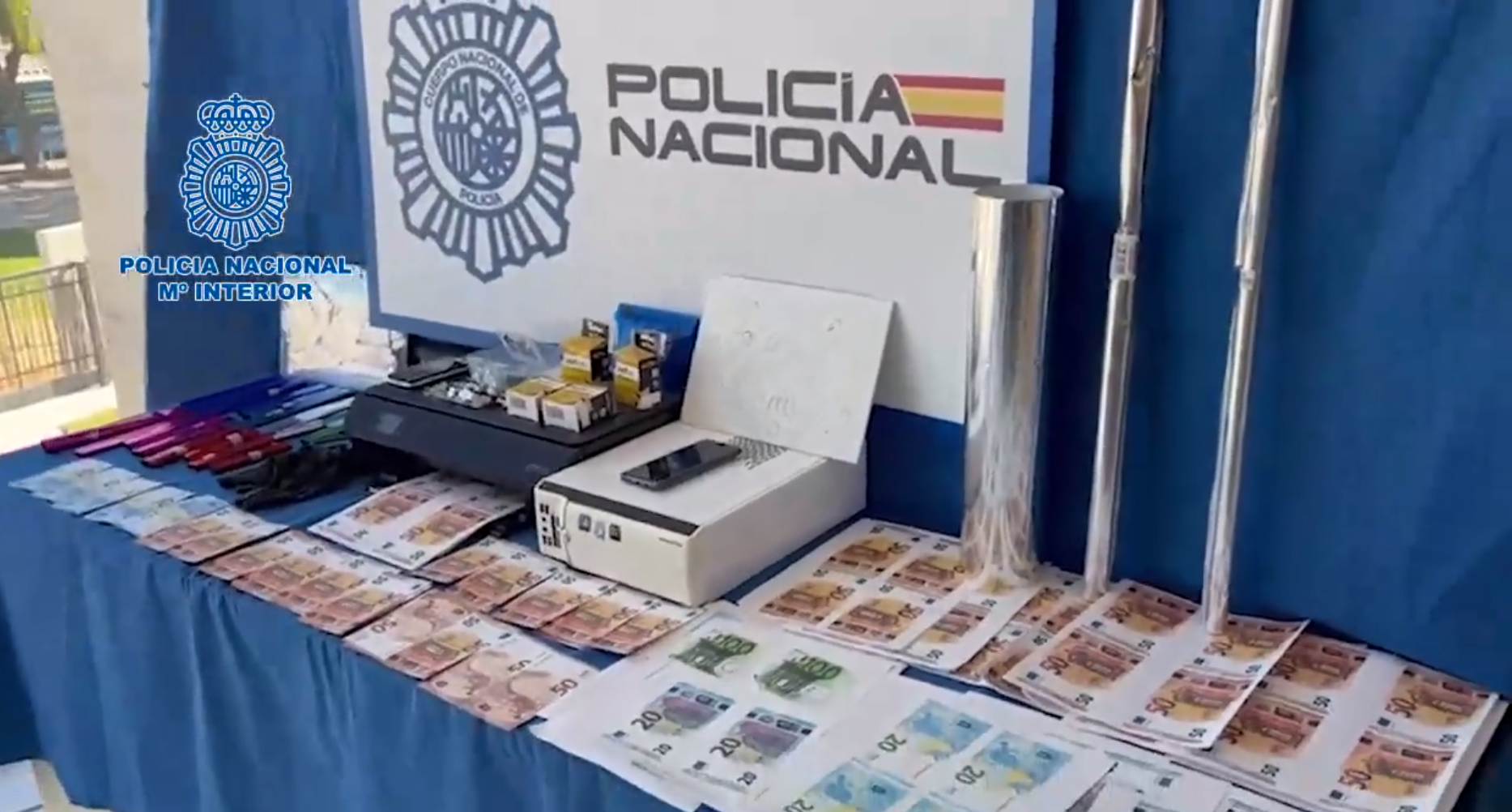 Entre los efectos intervenidos en el domicilio se localizaron billetes ya cortados de 50 y 20 euros a falta de hologramas; billetes de 50 y 20 euros en folios, aún sin cortar; una impresora; un ordenador; diferentes tipos de papel transferible metalizado para imitar la banda holográfica y cartuchos de tinta para impresora. Además se localizaron recortes de billetes de 100 euros con los que, según los investigadores estaría haciendo pruebas para en un futuro hacer una nueva falsificación de billetes de esa cantidad.