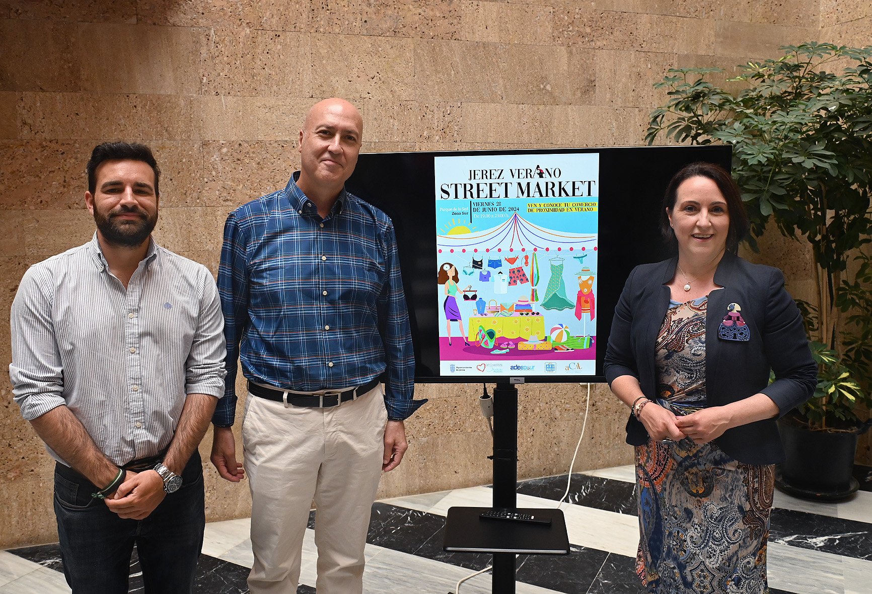 La delegada de Comercio y Consumo, Nela García, ha presentado este miércoles en el Ayuntamiento la primera edición del ‘Jerez Verano Street Market’, actividad organizada por el consistorio en la que más de 25 negocios de nuestra ciudad pertenecientes a ACOJE, ACAT, ADECOSUR y ASUNICO expondrán sus productos y artículos con el fin de visibilizar y promocionar el comercio local.  Esta feria de muestras en la calle tendrá lugar el día 28 de junio en el Parque de la Sed en horario de 19 a 23 horas. A la presentación de esta iniciativa han participado Juan García, presidente Adecosur, y Alberto de la Villa, gerente de Acoje.