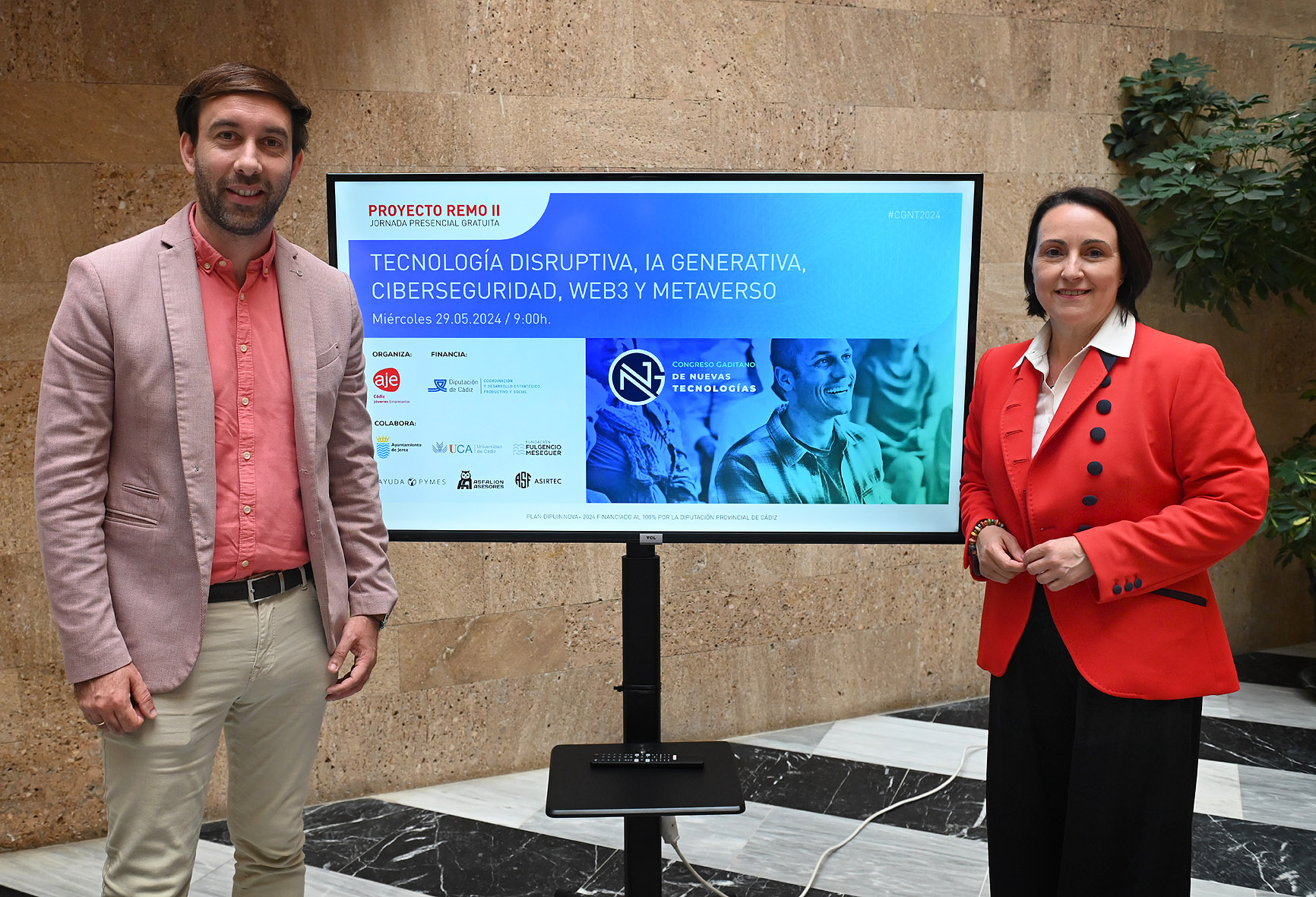 La delegada de Empleo, Trabajo Autónomo Comercio y Empresa, Nela García, junto al presidente de la Asociación de Jóvenes Empresarios de Cádiz -AJE Cádiz, Juan Antonio Parra, han presentado este jueves el II Congreso Gaditano de Nuevas Tecnologías de AJE Cádiz, que va a celebrarse el próximo miércoles, día 29 de mayo, en los Museos de la Atalaya, bajo el título: ‘Tecnología disruptiva, Blockchain, IA Generativa, Ciberseguridad, Web3 y Metaverso’.