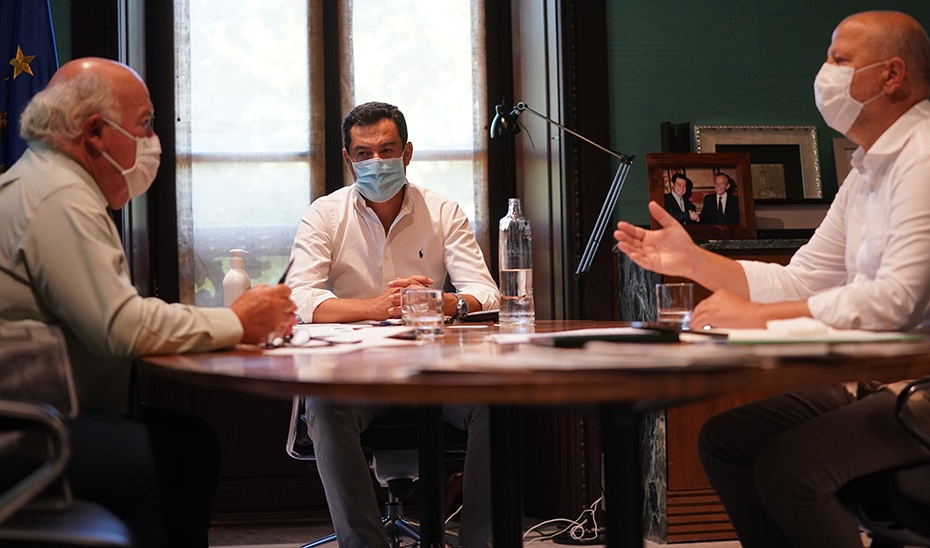 El presidente de la Junta de Andalucía, Juanma Moreno, ha mantenido este miércoles una reunión con los consejeros de Educación y Deporte, Javier Imbroda, Salud y Familias, Jesús Aguirre, de cara a la conferencia interterritorial conjunta convocada por los Ministerios de Sanidad, Consumo y Bienestar Social y Educación y Formación Profesional para tratar con las comunidades autónomas la vuelta al cole, que tendrá lugar el 27 de agosto.