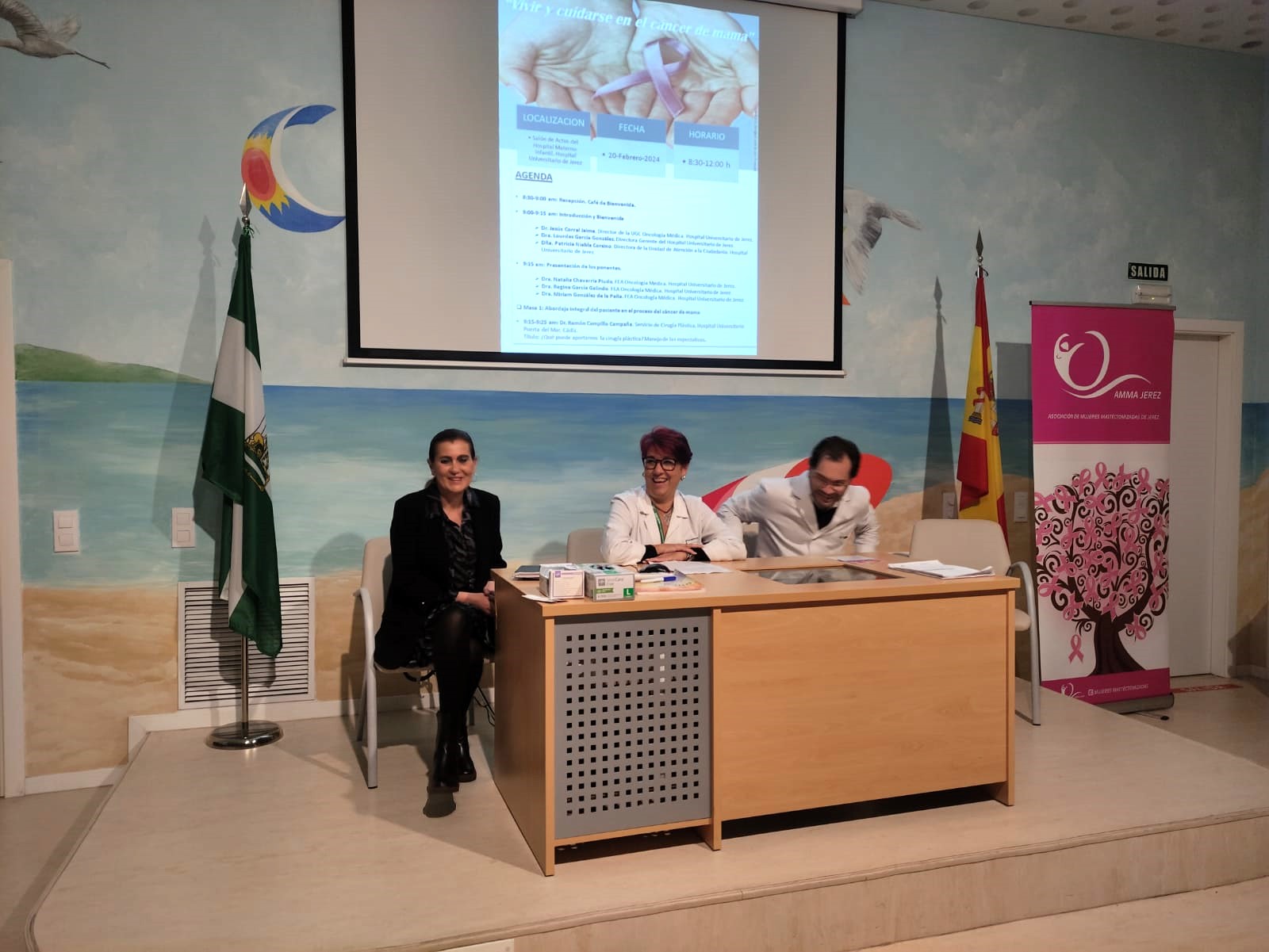 El Hospital Universitario de Jerez ha acogido hoy la jornada ‘Vivir y cuidarse en el cáncer de mama’, una iniciativa de la Unidad de Oncología Médica en colaboración con la Asociación de Mujeres Mastectomizadas (AMMA), ya que principalmente se dirige al tejido asociativo y a sus representantes, para tratar de responder cuestiones en torno a esta enfermedad y no sólo desde el punto de vista asistencial. La convocatoria ha tenido un gran respaldo, con un centenar de asistentes en el salón de actos del Hospital Materno-Infantil.