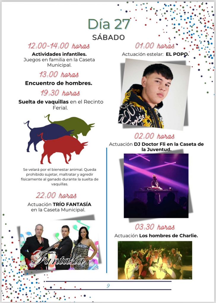 El sábado, 27 comenzará con actividades infantiles, seguirá con un encuentro de hombres a las 13 horas y con la suelta de vaquillas, a las 19,30 horas en el recinto ferial para continuar con las actuaciones del Trío Fantasía, la actuación estelar de El Popo a partir de la una de la madrugada y de Los hombres de Charlie a las tres y media. Además, a las dos, la Caseta de la Juventud acogerá la actuación del DJ Doctor Fli.