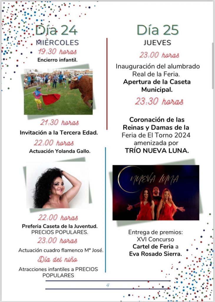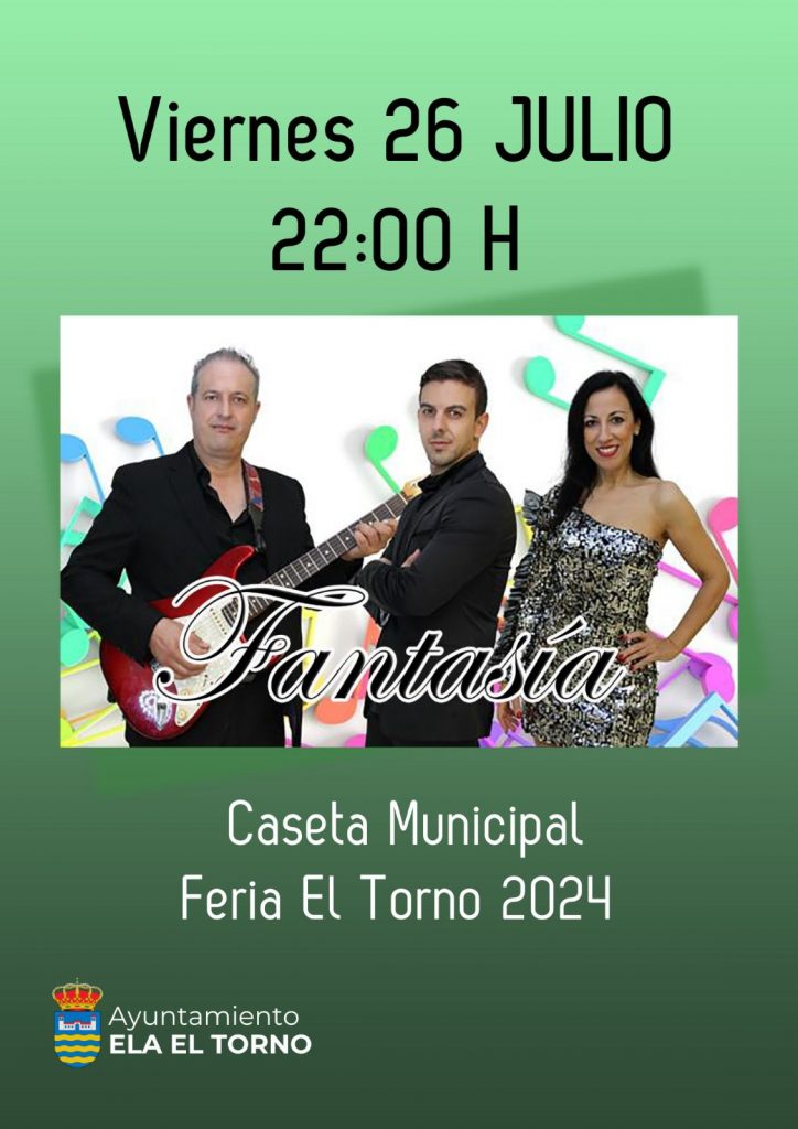 El Ayuntamiento de El Torno ha preparado un detallado programa en el que la música en directo con las actuaciones estelares siempre de carácter gratuito las noches de viernes, sábado y domingo y la animación musical diaria a cargo de grupos y orquestas muy queridos en la ELA ocuparán un lugar principal en la gran caseta instalada en la Plaza Artesanía.