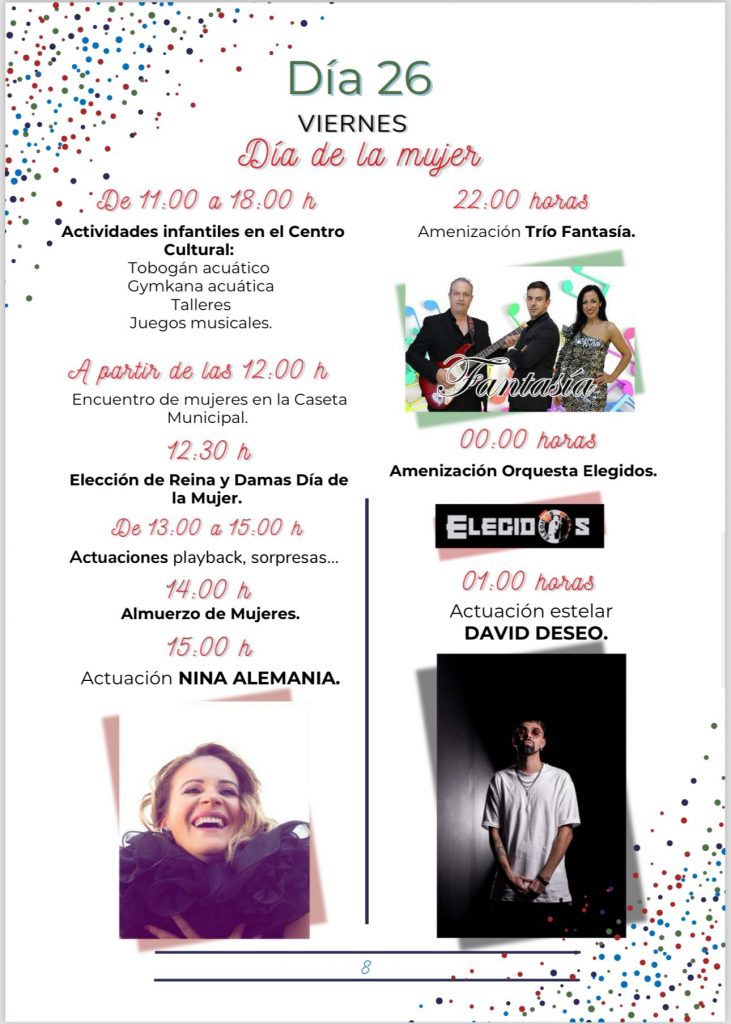 El viernes, día 26, día de la Mujer, se ha previsto una jornada de convivencia femenina a partir de las doce y media de la mañana que contará con la actuación de Nina Alemania a partir de las tres de la tarde y con distintas actividades centradas en las participantes. Además, durante la jornada del viernes también funcionará con ludoteca en el centro cultural para los peques de 3 a 12 años. Además, a partir de las 10 de la noche, la Caseta Municipal se llenará de música con las actuaciones musicales del Trío Fantasía, la Orquesta Elegidos y, finalmente, desde la una de la madrugada, la actuación estelar de David Deseo.