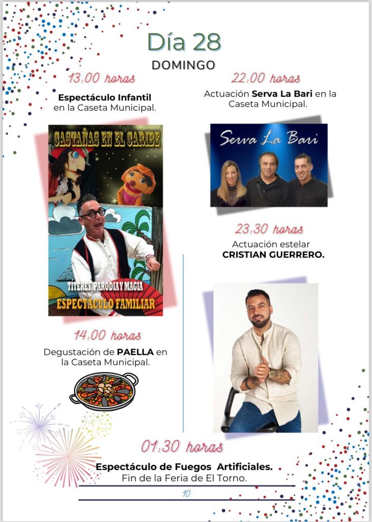 La mañana del domingo, día 28 estará dedicada a toda la familia, con el espectáculo infantil de títeres Castañas en el Caribe y seguirá con la degustación de una paella a las dos en la Caseta Municipal. La noche estará amenizada por la actuación, a partir de las diez del grupo Serva La Bari y la posterior actuación estelar de Cristian Guerrero. El punto final de la Feria lo pondrán los fuegos artificiales que, como colofón, se disfrutarán la noche, ya madrugada del domingo.