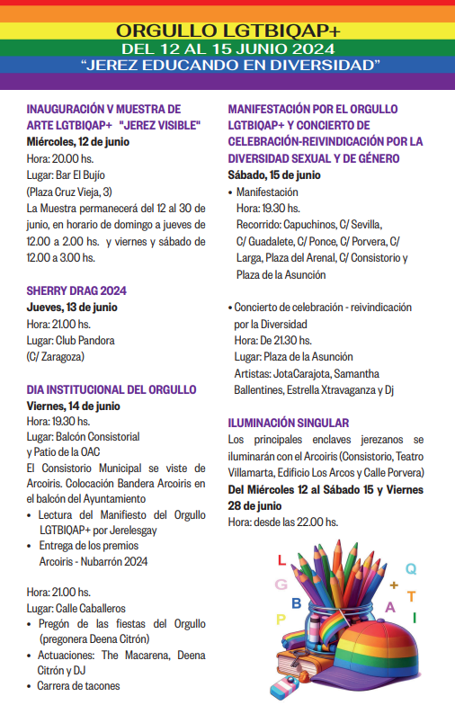 Este ciclo dará comienzo el miércoles 12 de junio, a las 20 horas, con la apertura de la V Muestra de Arte LGTBIQAP+ ‘Jerez visible’, en el Bar El Bujío (plaza Cruz Vieja). La muestra podrá visitarse del 12 al 30 de junio, en horario de domingo a jueves, de 12 a 2 horas, y viernes y sábado de 12 a 3 horas. Las actividades continuarán el jueves 13 de junio a las 21 horas con el espectáculo Sherry Drag 2024, en Club Pandora (calle Zaragoza).