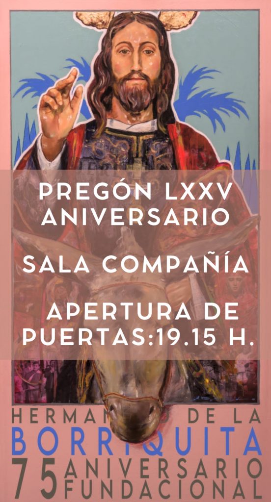 Con motivo del LXXV aniversario fundacional de la hermandad de la borriquita. hoy viernes 31 de mayo tendrá lugar en la sala compañía el pregón a cargo de NHD. Manuel Serrano Jiménez, se celebrará a las 20.00 horas y la apertura de puertas se llevará a cabo a las 19.15 para poder acceder al interior de la sala hasta completar su aforo.