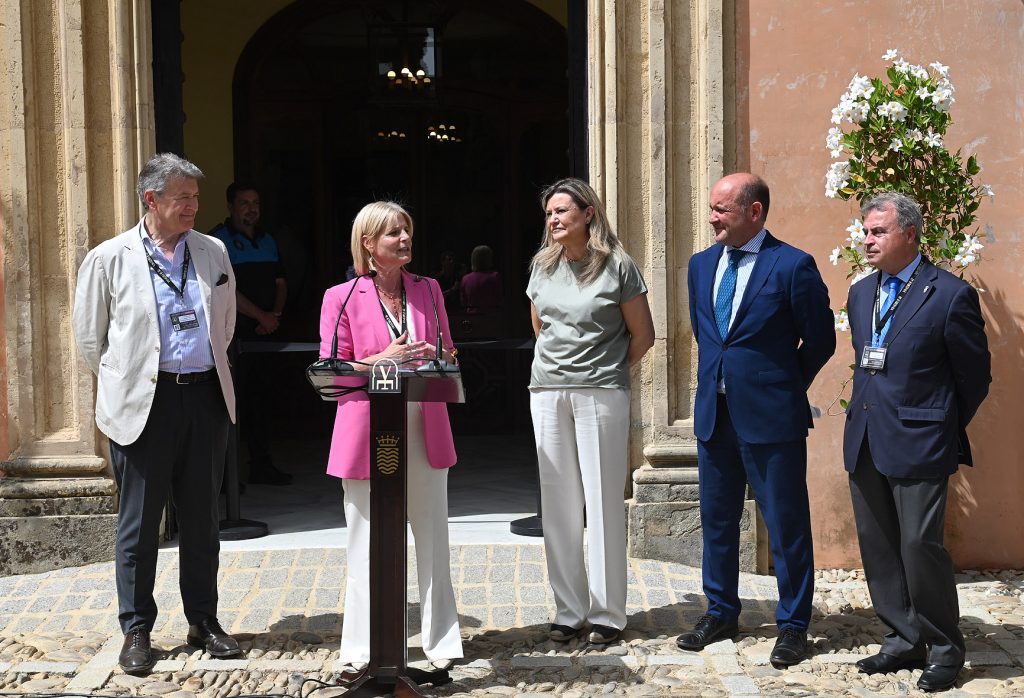 La alcaldesa de Jerez, María José García-Pelayo, acompañada de la directora General de Industrias, Innovación y Cadena Alimentaria de la Junta de Andalucía, Cristina de Toro Navero, el vicepresidente primero de Diputación de Cádiz, Juan José Ortiz Quevedo, y del presidente del Consejo Regulador, César Saldaña, ha inaugurado este domingo el XII Salón Internacional de los Vinos Nobles, Generosos, Licorosos y Dulces Especiales Vinoble que se celebrará hasta el martes 28 de mayo en el recinto de El Alcázar de nuestra ciudad.