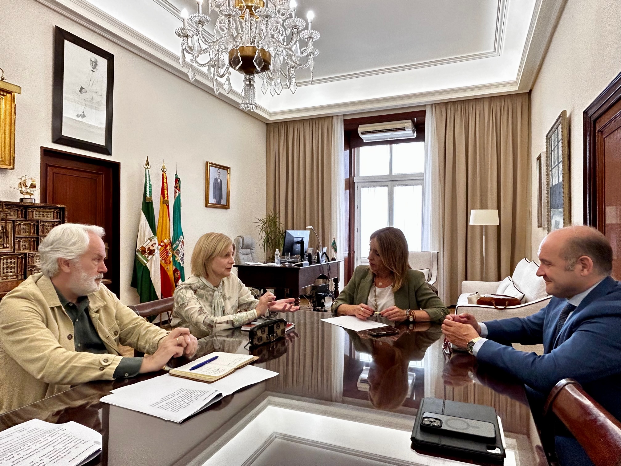 La alcaldesa de Jerez, María José García-Pelayo, y la presidenta de la Diputación Provincial de Cádiz, Almudena Martínez, han mantenido una reunión de trabajo en la sede de la institución provincial en la que han estado acompañadas del vicepresidente primero de la Diputación, Juan José Ortiz, y el primer teniente de alcaldesa del Ayuntamiento, Agustín Muñoz.