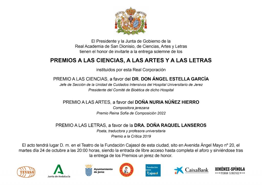La entrega de los Premios de la Real Academia San Dionisio a las Ciencias, Artes y Letras tendrá lugar en el Teatro de la Fundación Cajasol (avenida Ángel Mayo, 20) a partir de las 20:00 horas, siendo la entrada de libre acceso hasta completar el aforo. Tras el acto se servirá un jerez de honor para brindar por los premios.