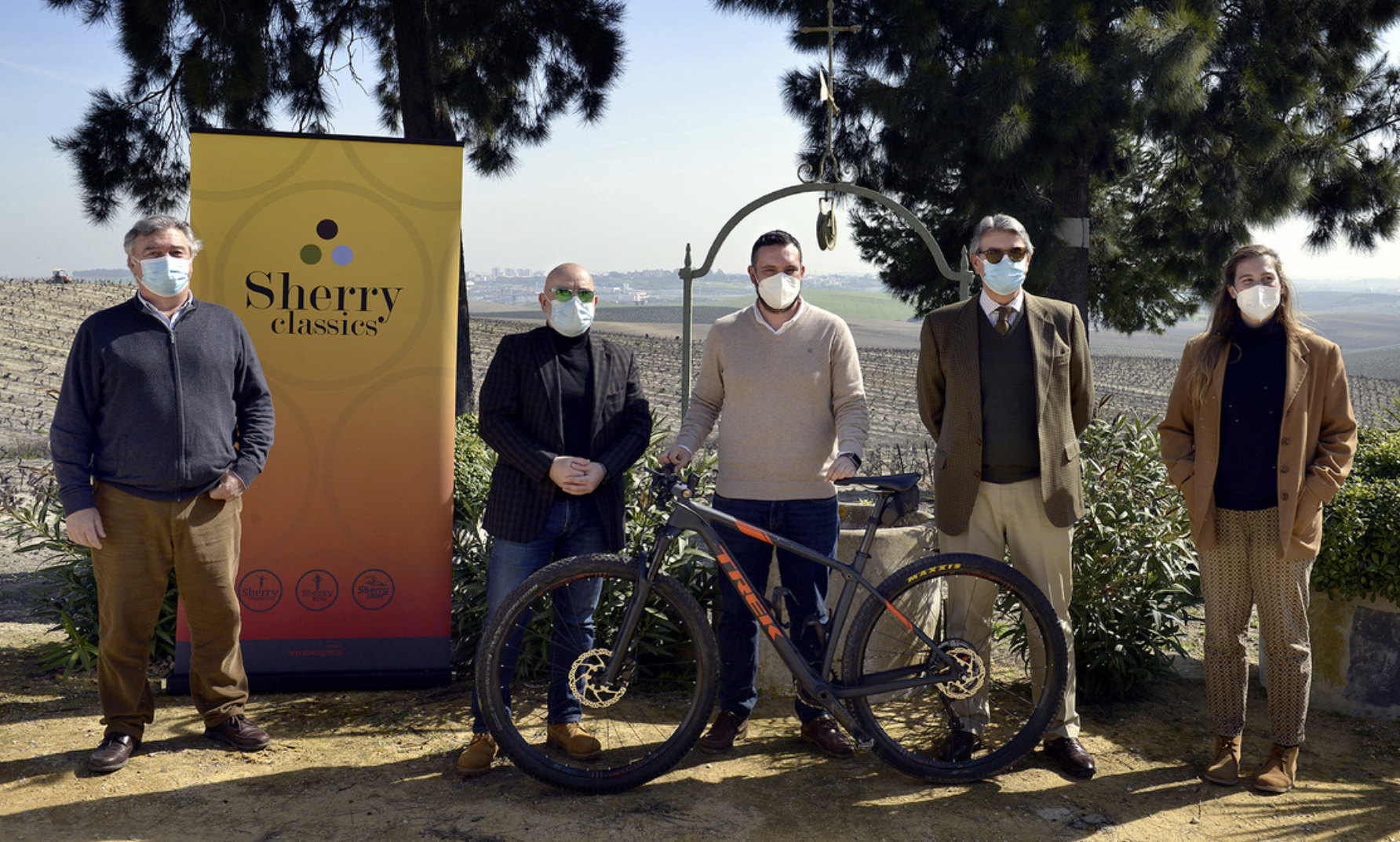 El delegado de Deportes y Medio Rural, Jesús Alba, junto al presidente del Consejo Regulador de la DO Jerez-Xérès-Sherry y Manzanilla-Sanlúcar de Barrameda, César Saldaña, el director de TerraIncognita Global, José Manuel Toledo, el viticultor y copropietario del Cerro del Obregón, Javier Sánchez Delage y la enóloga María Sánchez, ha presentado la Sherry Bike 2021, una competición deportiva de ciclismo de montaña que se disputará el próximo domingo 16 de mayo y que discurrirá entre la ciudad y el mar de viñas que circundan y forman parte del Marco del Jerez. Jesús Alba ha presentado este evento deportivo como “una iniciativa novedosa, que pone en valor el patrimonio cultural del viñedo del Marco de Jerez y la gran afición al ciclismo existente en la ciudad”.