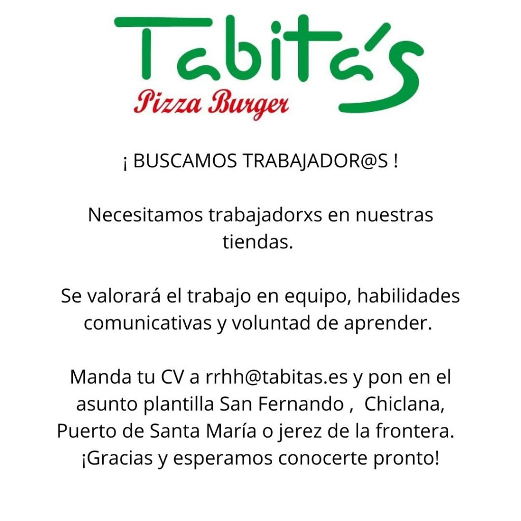 Nueva oferta de empleo en Jerez. En esta ocasión, desde las redes sociales de la pizzería Tabita’s han publicado que necesitan trabajadores/as en sus locales de Jerez y el resto de la provincia.