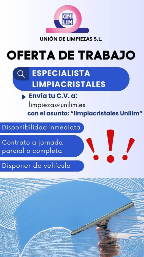 Asimismo, necesitan disponibilidad inmediata y disponer de vehículo propio. Por ello, si estas interesado en esta oferta de trabajo deberás enviar tu cv al correo limpiezas@unilim.es con el asunto «limpiacristales Unilim».