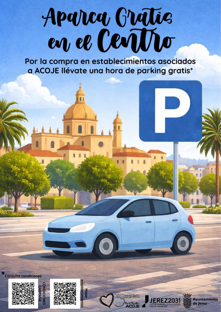 La Asociación de Comerciantes del Centro de Jerez (ACOJE) ha puesto en marcha, un año más, una campaña de ayuda a los que apuesten por el centro de la ciudad para realizar sus compras. La presente campaña permite a los clientes obtener un ticket de una hora de aparcamiento gratuito por compras realizadas en los establecimientos adheridos a la Asociación de Comerciantes de Jerez.