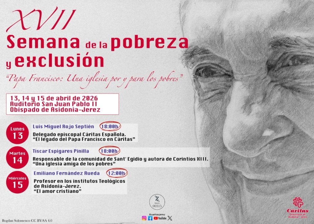 Este ciclo de conferencias comenzará mañana, lunes 13 de abril, a las 18.00 horas, con la intervención de Luis Miguel Rojo Septién, delegado episcopal de Cáritas Española, con su ponencia “El legado del Papa Francisco en Cáritas”. A continuación, el martes 14, en el mismo horario, será el turno de Tíscar Espigares Pinilla, responsable de la comunidad de Sant’ Egidio y autora de Corintios XIII con su intervención sobre “Una Iglesia amiga de los pobres”. Por último, cerrará este ciclo de conferencias, el miércoles 15, pero a las 12.00 horas, Emiliano Fernández Rueda, profesor en los Institutos Teológicos de Asidonia-Jerez con su conferencia sobre «El amor cristiano».