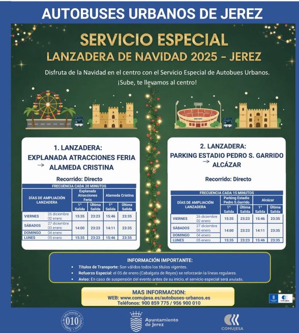Visto el buen resultado de las líneas lanzaderas de autobuses se amplía la activación para los días festivos que quedan por delante hasta concluir el periodo navideño.De este modo, el ayuntamiento amplía los días de activación de las líneas: Explanada Atracciones Feria-Alameda Cristina y Parking Estadio Pedro S. Garrido-Alcázar. De esta manera, estarán vigentes los viernes 26 de diciembre y 2 de enero; los sábados 27 de diciembre y 3 de enero; el domingo 4 de enero y el lunes 5 de enero.
