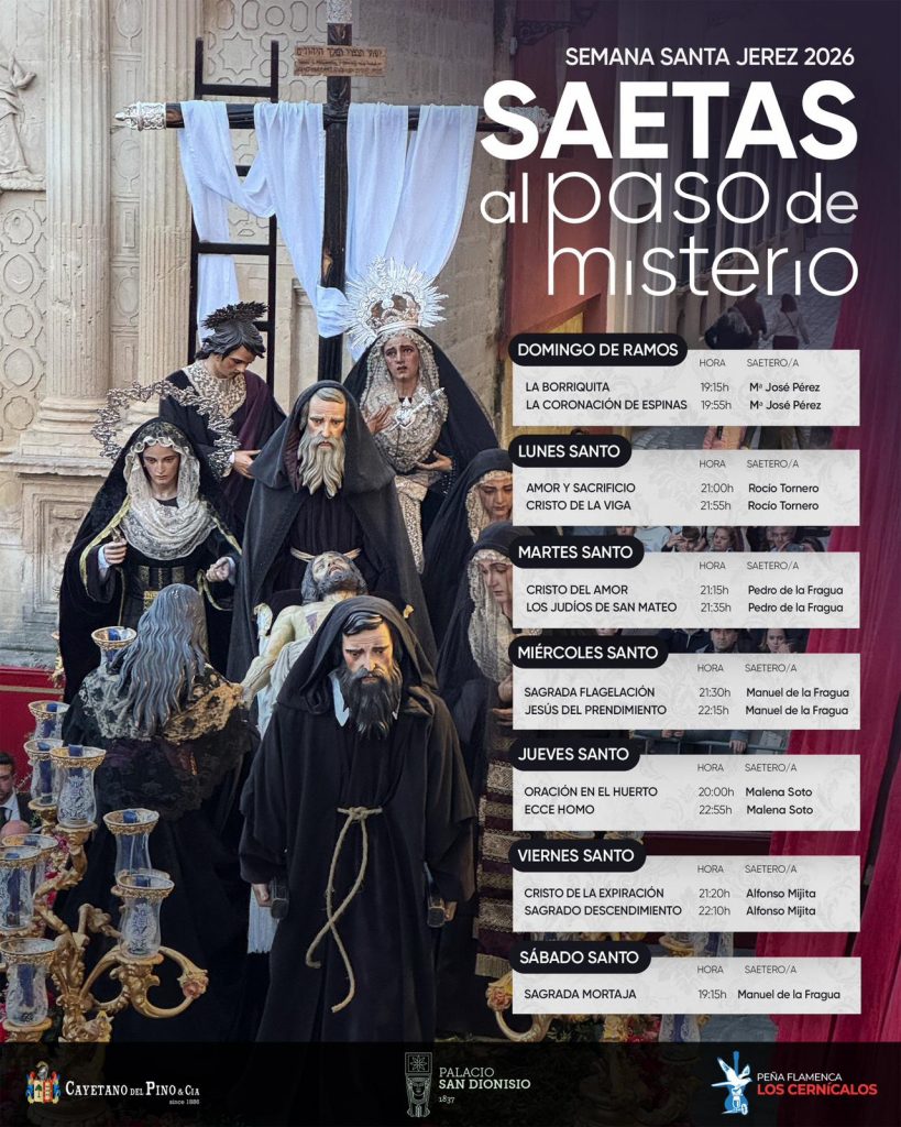 El evento, impulsado como parte de la programación cultural del propio palacio —que combina su faceta museística con actividades abiertas a la ciudadanía—, cuenta con la colaboración de Bodegas Cayetano del Pino y la implicación de la Peña Los Cernícalos, encargada de configurar el elenco de saeteros. Además, en la presentación, se ha destacado el papel fundamental de las hermandades, que «facilitarán las paradas de los pasos para permitir la correcta interpretación de las saetas».