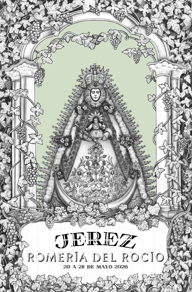 Real Hermandad del Rocío de Jerez de la Frontera ya tiene cartel para su romería de este año. Firmado por el artista, Fran Gil, la obra representa a una Virgen del Rocío propia de las estampas decimonónicas, inspirada en los azulejos antiguos.