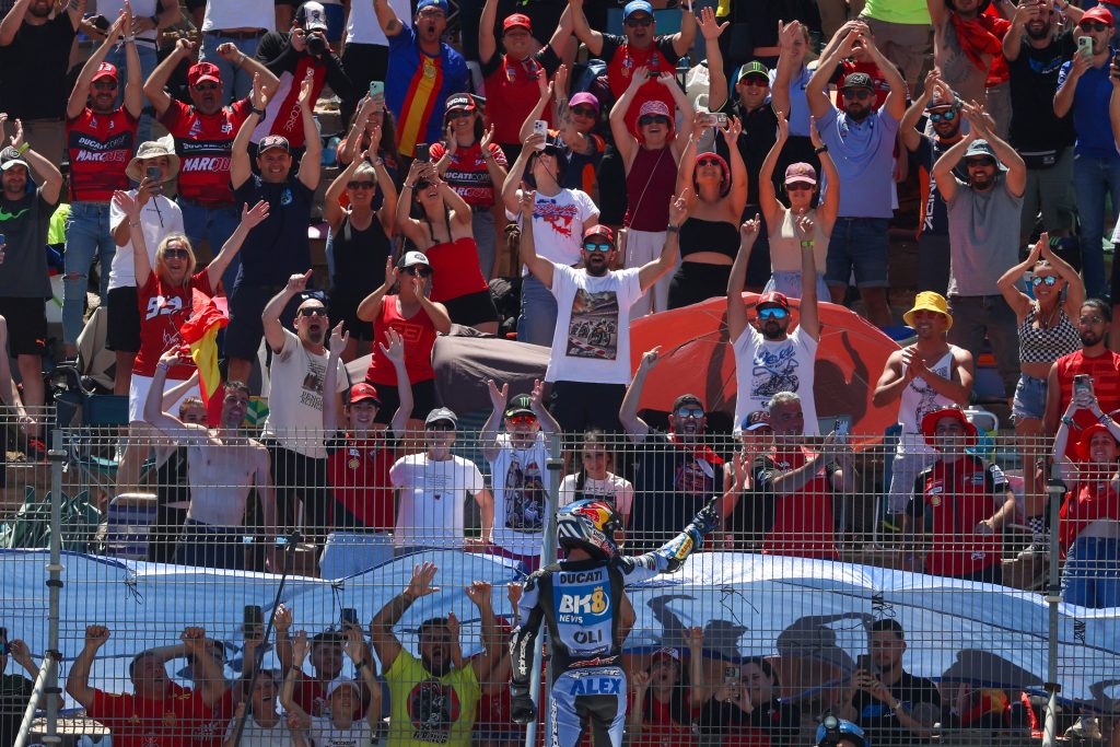 La carrera de la categoría reina del Gran Premio de España 2026 en el Circuito de Jerez – Ángel Nieto ha regalado un show de constancia y velocidad desde el mismo instante en que se apagó el semáforo, aunque con un comienzo bastante intenso. Una vez comenzó la carrera, los pilotos salieron como verdaderos cohetes con ruedas. Marc Márquez llegaba a la primera curva defendiendo la primera posición, pero pronto su hermano, Álex Márquez, comenzaba a mostrar sus cartas con una maniobra magistral en la curva 9, adelantando a Marco Bezzecchi ante una afición entregada que rugía desde la pelousse. La tensión aumentaba vuelta a vuelta hasta que, en la curva Dani Pedrosa, Álex lanzaba un ataque decidido sobre Marc, dejando claro que la victoria tenía nombre propio en disputa familiar. Sin embargo, el guion daría un giro dramático pocas curvas después, cuando Marc sufría una caída en la rápida Crivillé, dejando el liderato en manos de Álex, seguido por Bezzecchi y Fabio Di Giannantonio. A partir de ahí, el menor de los Márquez impuso un ritmo demoledor, rodando en 37 altos con una consistencia inalcanzable que le permitió abrir una ventaja superior a los dos segundos. En su última vuelta, y con el circuito rendido a sus pies, Álex saludaba a la afición en Nieto-Peluqui antes de cruzar la meta y firmar su primera victoria de la temporada y segunda consecutiva en Jerez. “Hemos sufrido mucho desde el principio de temporada, pero este fin de semana, los resultados han hecho que estemos más motivados que nunca. Para mí el objetivo de hoy estaba claro, ir desde la primera vuelta apretando al máximo e intentar mantener el ritmo de 37’’, declara Álex. No tengo palabras para describir este momento, estoy muy feliz por cómo ha ido la carrera”, declaraba emocionado, mientras Bezzecchi reconocía: «Estoy muy feliz por la carrera de hoy, Álex ha ido muy rápido, mi más sincera enhorabuena. Ha sido un buen fin de semana, no soy español, pero me he sentido muy apoyado por todos los aficionados. Ahora a pensar en Le Mans”. DiGiannantonio cerraba el pódium compartiendo con los micros, “una vez pasé a Martin y aseguré el tercer puesto intenté ir tras Bezzechi, pero estaba rondando muy rápido. Ha sido una gran carrera y quiero agradecer a todo mi equipo por el trabajo que han hecho este fin de semana”.