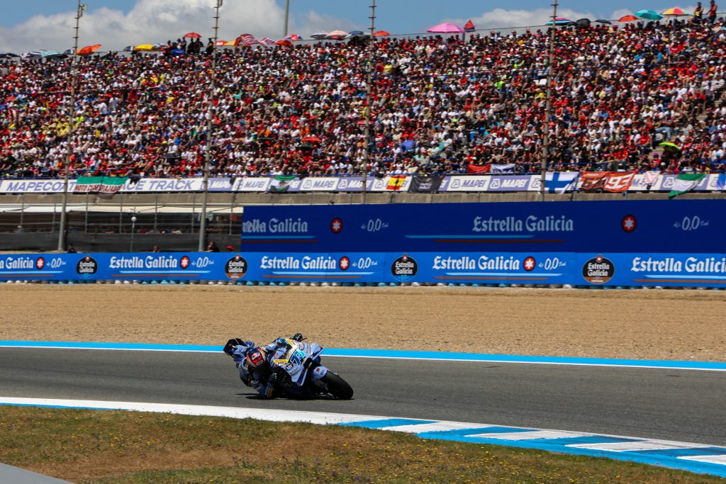 El domingo por la mañana daba comienzo en el Circuito de Jerez – Ángel Nieto, el último baile del Gran Premio Estrella Galicia 0’0 de España y de un fin de semana irrepetible, marcado desde el viernes por una meteorología cambiante que puso a prueba a todos, pero que dio paso a la mejor versión del trazado andaluz: sol radiante, temperatura perfecta y una pista lista para el espectáculo. Desde antes de las seis de la mañana, miles de aficionados cruzaban las puertas de acceso al circuito rumbo a la Pelousse, protagonizando una de esas estampas que solo se viven aquí, con la noche iluminada por miles de linternas de los móviles al unísono, guiados por la voz del speaker y coronados por un mensaje que ya es identidad: “This is Jerez”, una imagen única en el calendario de MotoGP que resume, en un solo instante, la magia de este Gran Premio saldado nuevamente con gran éxito.